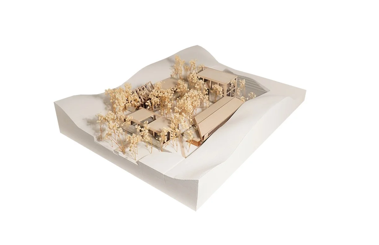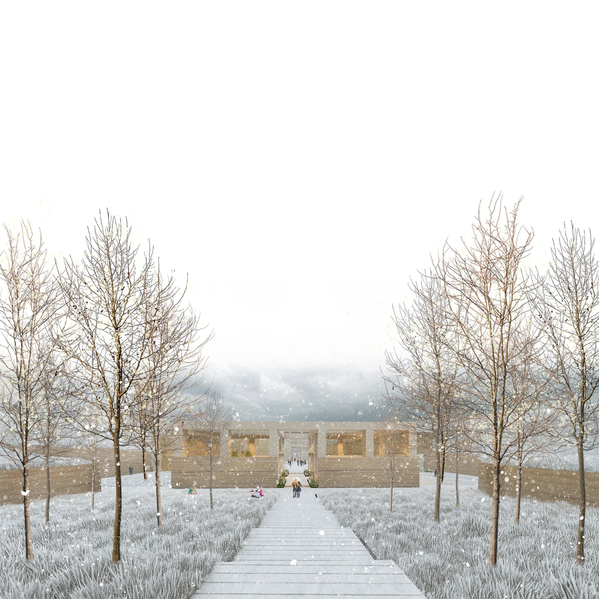 The site was chosen due to its close proximity to the entrance of the park, where visitors can easily come and go, and where the structure is nestled into the landscape to be visually unobtrusive to the nature around it. Additionally, how the structure is situated creates a sound barrier to help block off noise from the road. The buildings are made predominantly of locally sourced mass timber from Colorado and rammed earth taken from the excavation site, limiting the CO2 emitted into the atmosphere and allowing the thermal mass of the rammed earth to passively heat and cool the structures. Many trees are added to the site. This is to encourage nature to meld with the buildings around it, as well as to facilitate in passive heating strategies, where they shade buildings in the winter, and the loss of leaves in the winter allow for the sun to stream through and warm the buildings.