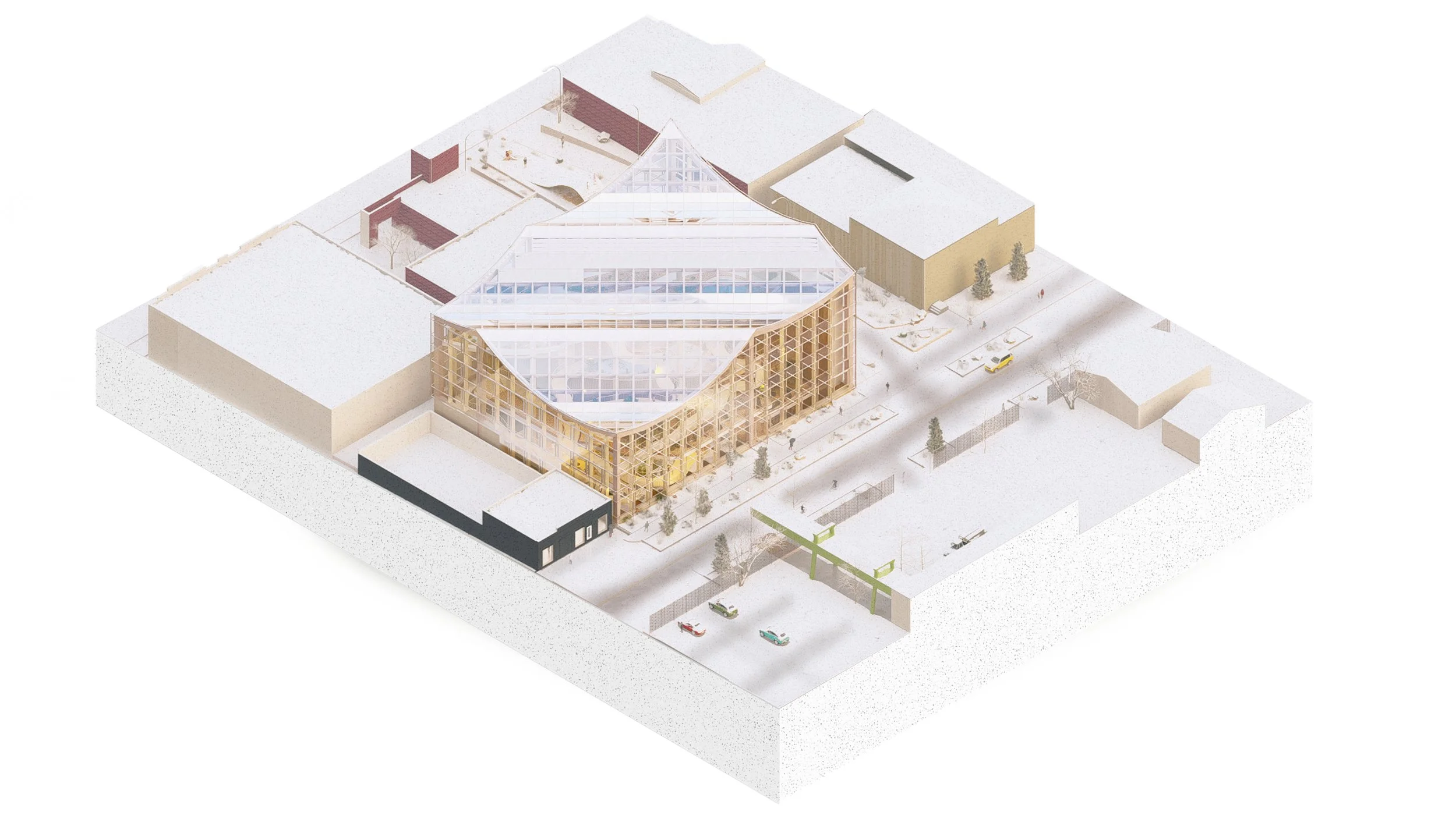 With all of that in mind, what sort of building does one create in a location such as this, where all the things needed to go into a building are going to be attempted to put into it, while having the program largely focus on the idea of sustainable indoor growing of possibly various sorts?